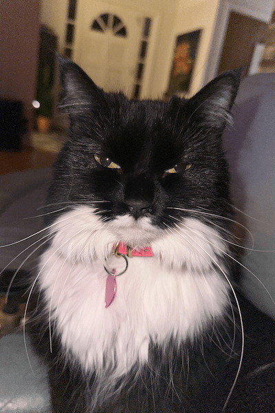 Pinky, the tuxedo cat, came into our lives because we tagged along with my mom when she was looking to adopt a new cat. Baby Pinky was in her crate, upside down, sleeping with her head in her food bowl. I was immediately like … she is so cool. Got her that day.