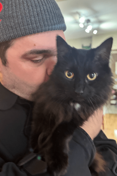 Olive is a domestic longhair/medium hair, and Ava is a domestic shorthair spotted tabby. They’re sisters, and Olive looks closer to their mom than Ava, Daka says. They’ll turn 5 in human years the day after Valentine’s Day next year.