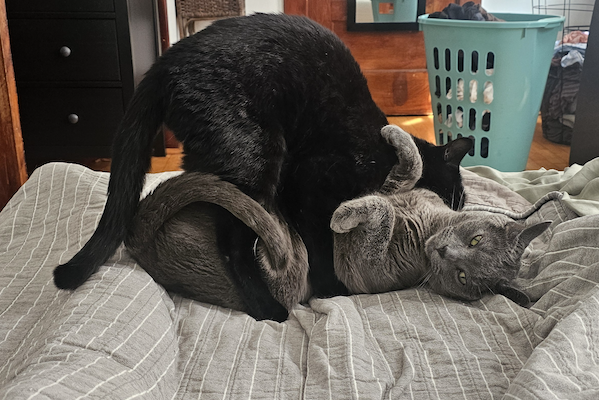 Depending on Disney’s mood it can go either way. Either they’re sleeping together and grooming each other or he doesn’t want anything to do with Casper and just wants me to himself. Being the bold one, he dictates the mood for the day.