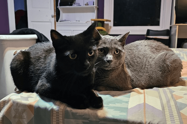 They both were adopted from the Animal Humane Society. I got Casper first, during the pandemic; he came from a hoarder house, so he was very thin and sick. Thinking of him back then still makes me tear up. Disney was adopted a year later while I was working for the Humane Society. I went to clean his cage, and he immediately jumped on my shoulders and began purring. I took him home the next day.