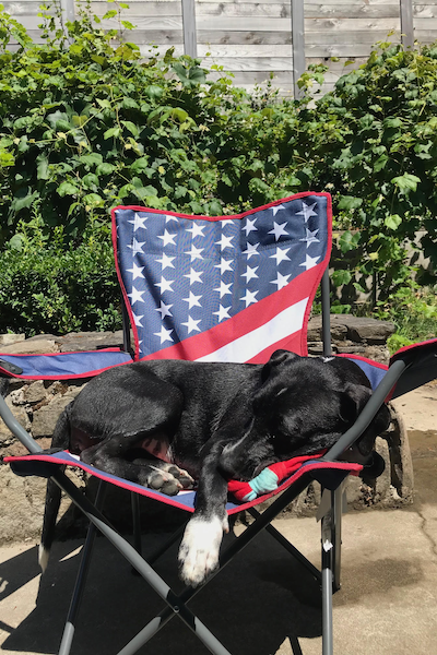 I can’t think of a specific anecdote, but she has two very funny characteristics that I haven’t mentioned yet. She’s very clumsy. She falls when jumping and bangs her nose on stuff while running all the time. The embarrassed look on her face kills us! She’s already lost two claws and a tooth from her falls and face bangs. The other thing is the way she sits in chairs. Since the first day we brought her home, she has thought it appropriate to sit at the table or on the lawn chairs with us. She just wants to do what we’re doing. Silly girl.