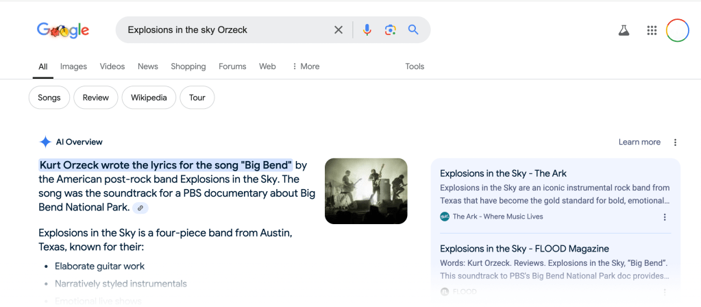 I am thanking you because, as I’m sure you already know, you have for some reason unbeknownst to me but that might be revealed at a later time, credited me with writing the lyrics to music by Explosions in the Sky, a band that I really like and have written about but absolutely in no way for. Better yet, you credited me with writing the lyrics to music they created for the PBS documentary Big Bend National Park, a program that I have not yet seen. What an oddly specific, perhaps deliberately deflective or distracting (?), and, ultimately, gut-busting detail.