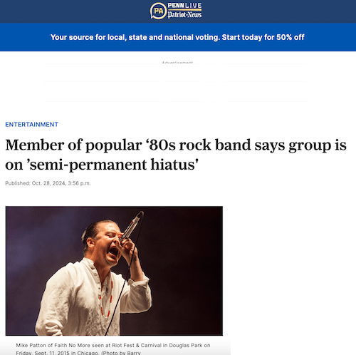 With all that in mind (and yeah, admittedly, it’s a lot), it was tantalizingly, worlds-colliding-ly bizarre to see Mike Patton – yeah, the Faith No More frontman whose infamous video juxtaposed him contorting like MC Hammer while an asphyxiating fish flopped and failed to its death – perform on CBS Saturday Morning to promote his new AVVT/PTTN project. This is the same Mike Patton who, as legend has it, gave himself an enema onstage at a San Francisco gig in 1991 and “shared” it with the crowd.” The same Mike Patton who supposedly drank his own urine at a different show two years later.